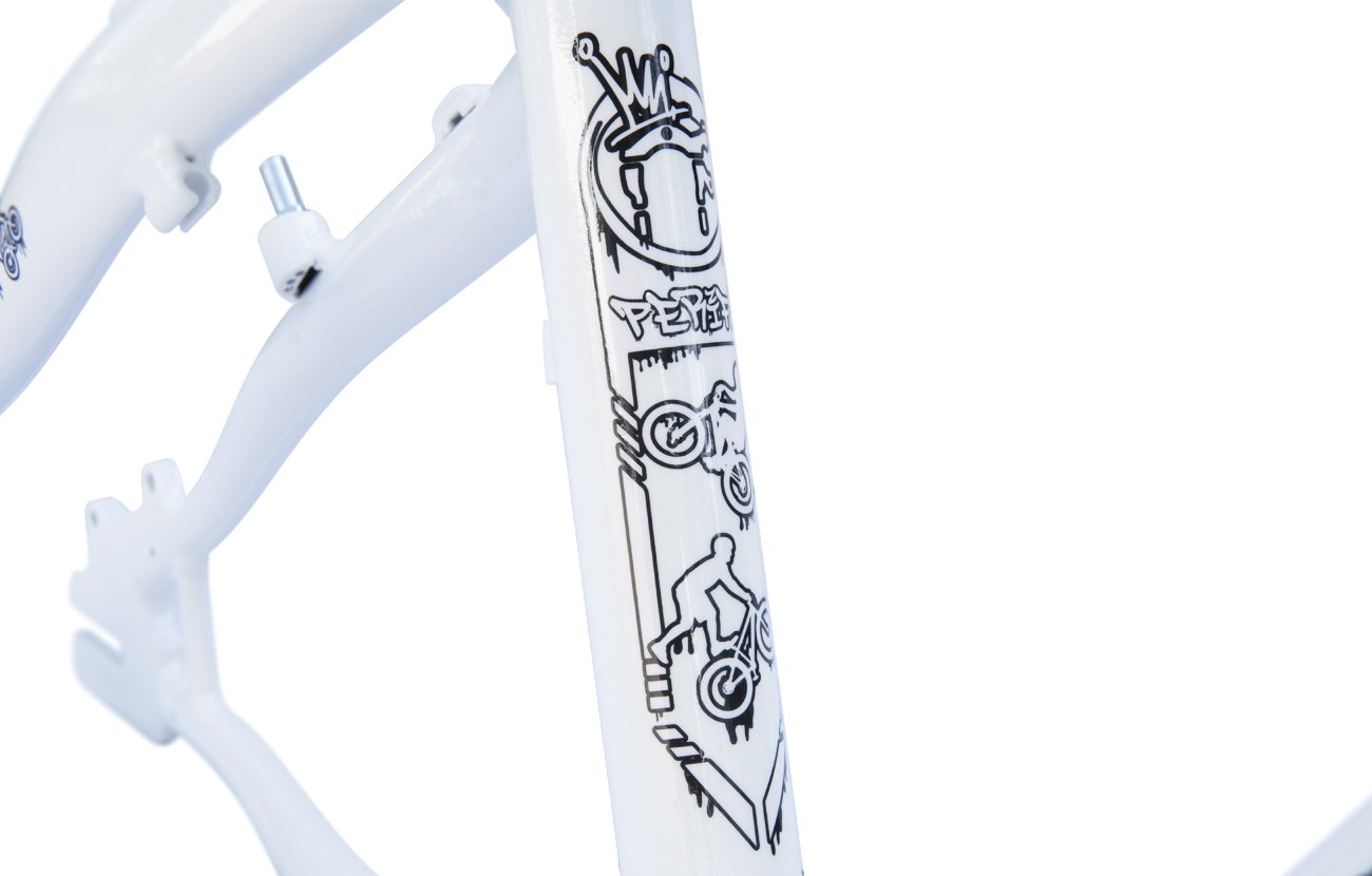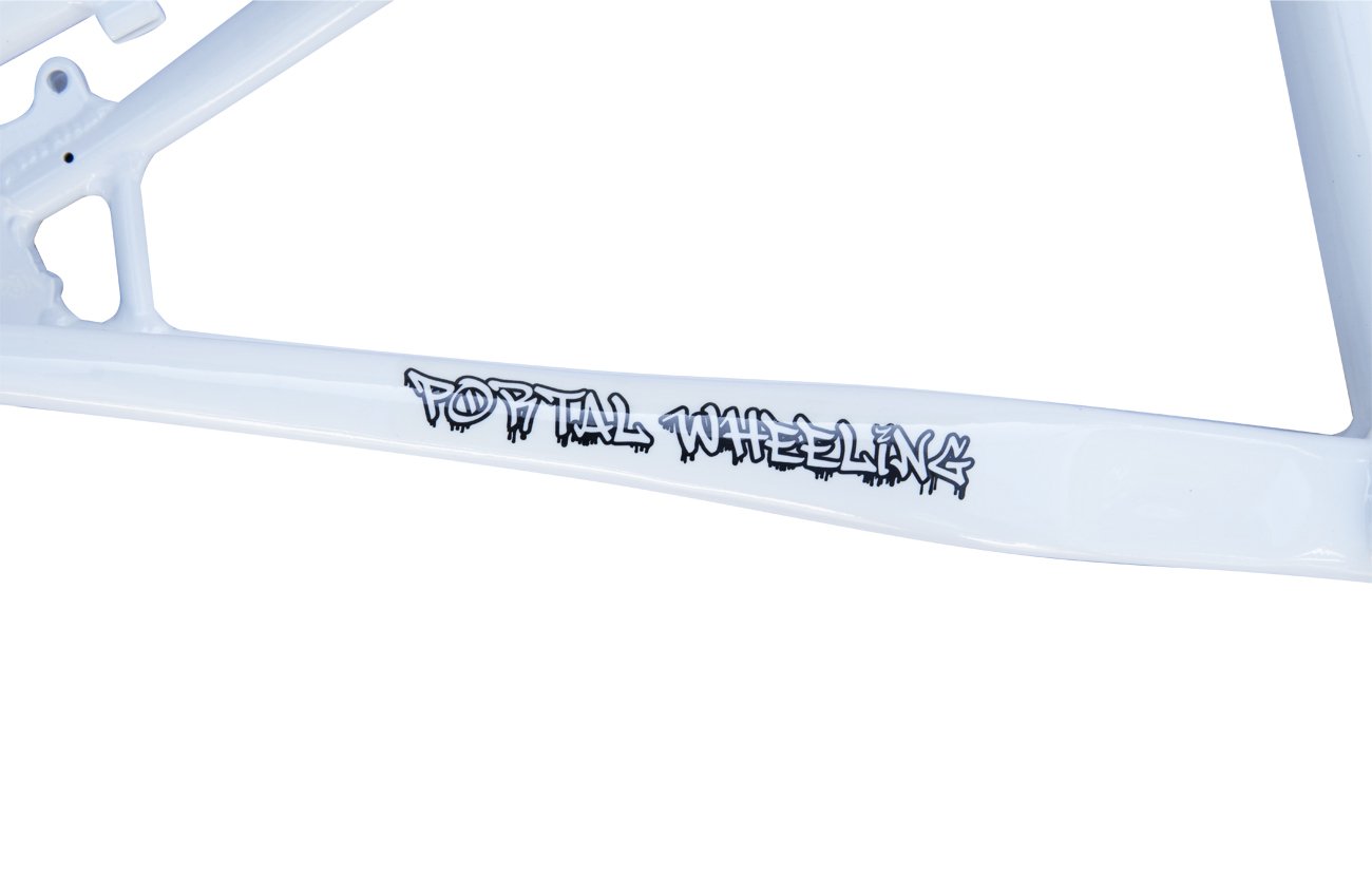 O design robusto e moderno do quadro PERIFA do Portal Wheeling é um destaque por si só. Sua aparência única certamente atrairá olhares de admiração, pois possui tubos largos, com curvas diferenciadas e adesivos que representam a modalidade Wheeling.
