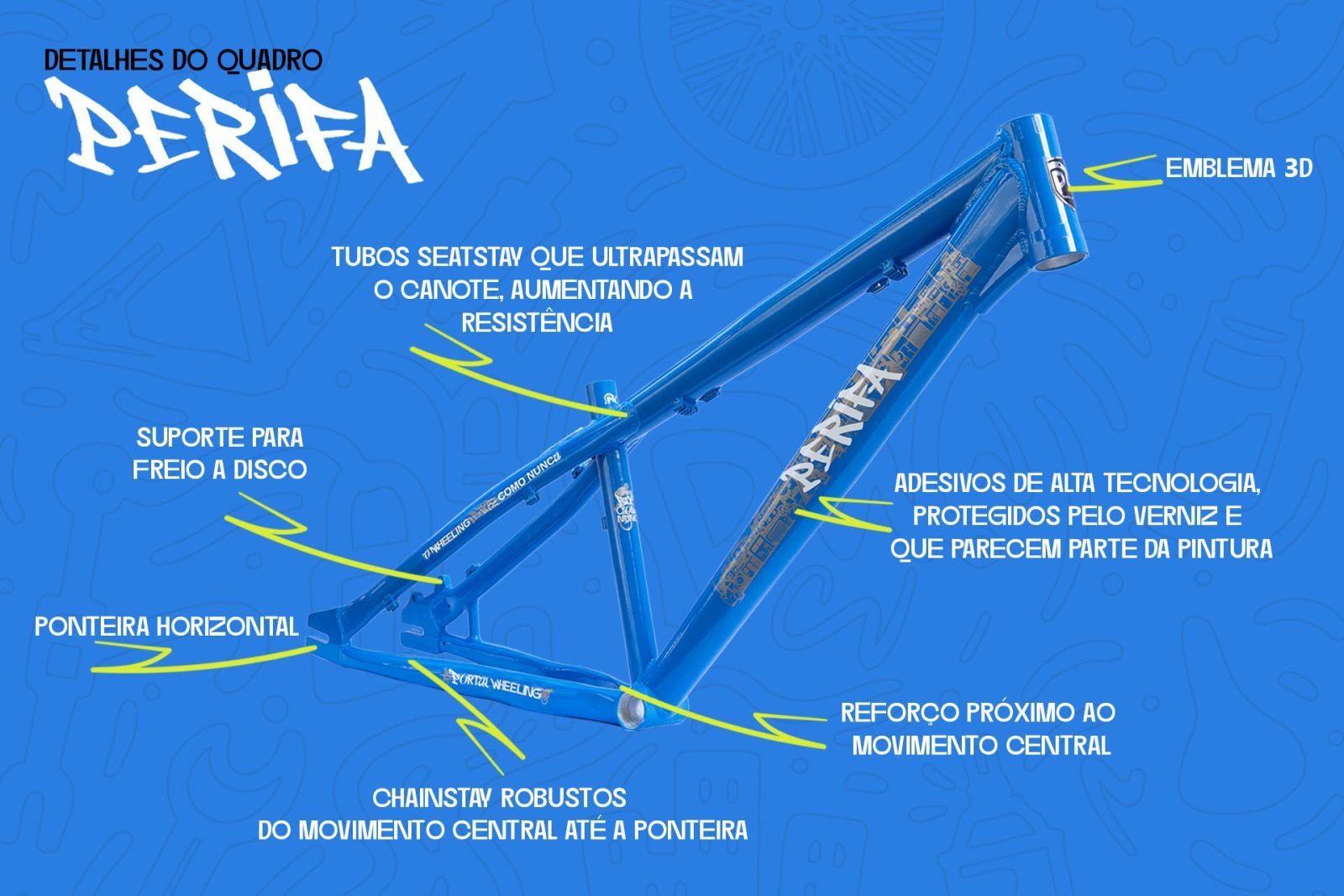 O design robusto e moderno do quadro PERIFA do Portal Wheeling é um destaque por si só. Sua aparência única certamente atrairá olhares de admiração, pois possui tubos largos, com curvas diferenciadas e adesivos que representam a modalidade Wheeling.