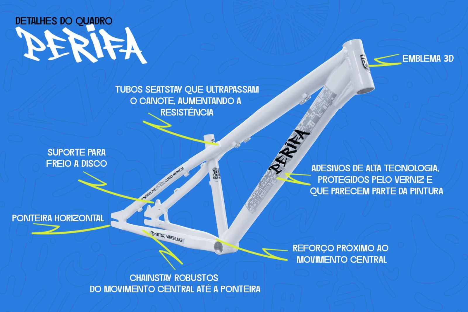 O design robusto e moderno do quadro PERIFA do Portal Wheeling é um destaque por si só. Sua aparência única certamente atrairá olhares de admiração, pois possui tubos largos, com curvas diferenciadas e adesivos que representam a modalidade Wheeling.