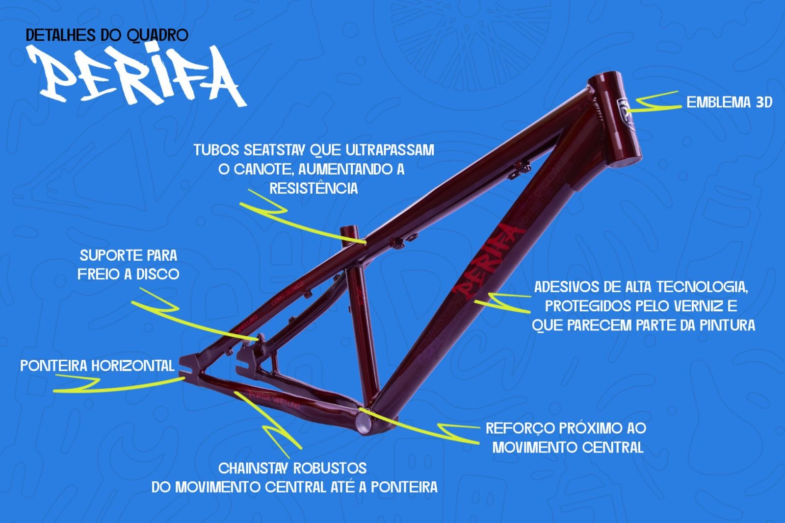 Fabricado em alumínio de alta qualidade e com tratamento térmico específico, o quadro PERIFA é leve e resistente, garantindo excelente durabilidade e agilidade durante as manobras. Para provar sua durabilidade, o quadro PERIFA
